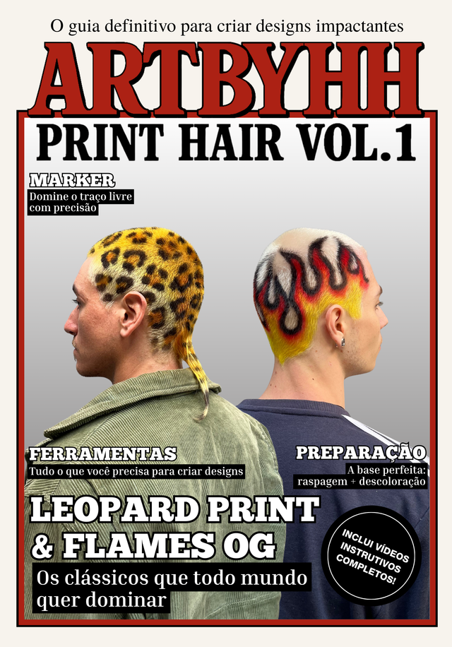 ARTBYHH – Print Hair Vol. 1 (Leopard Print & Flames OG) é um guia prático, visual e técnico, pensado para barbeiros, cabeleireiros, artistas e qualquer pessoa que queira aprender a criar print hair com mais controle, clareza e método.